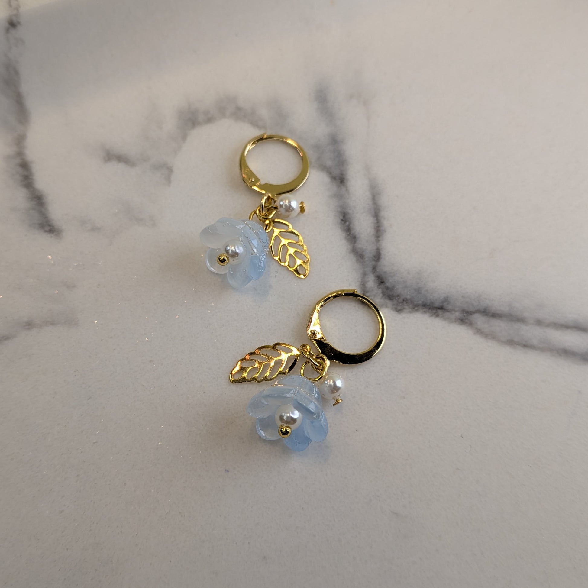 Gold hoop earrings | Floral hoop earrings | Blue lily earrings | Pearl charm earrings | Leaf charm earrings | Dainty gold earrings | Gold plated hoops | Nature inspired earrings | Handmade floral jewellery